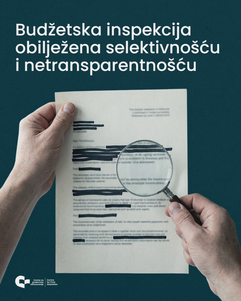CGO naglaava da postupanje Budžetske inspekcije po inicijativama koje ukazuju na moguće nepravilnosti ostaje selektivno i često bez vidljivog ishoda. Na primjer, u junu 2025. godine, CGO je uputio inicijativu za vršenje inspekcijskog nadzora u RTCG, povodom navoda o spornom upravljanju javnim sredstvima u toj instituciji. Iako je odgovor o prijemu inicijative stigao brzo, uz naznaku da će nadzor biti izvršen u narednom periodu, do danas nema javno dostupnih informacija da je to i učinjeno. Slično je bilo i sa drugim inicijativama što naglašava zatvorenost Budžetske inspekcije, ali i nejasne kriterijume odabira onih nad kojima se vrši nadzor.