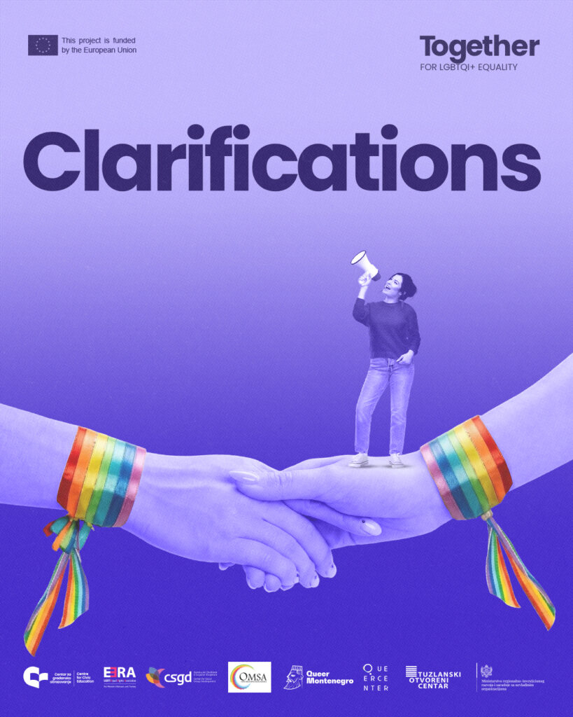 The project Together For LGBTQI+ Equality is implemented by the CCE/CGO, in partnership with ERA – LGBTI Equal Rights Association for Western Balkans and Turkey, Queer Montenegro, Queer Center Skopje, Tuzla Open Center, Open Mind Spectrum Albania, and Center for Social Group Development from Kosovo. The project is financed by the European Union and co-funded by the Ministry of Regional-Investment Development and Cooperation with Non-Governmental organisations.